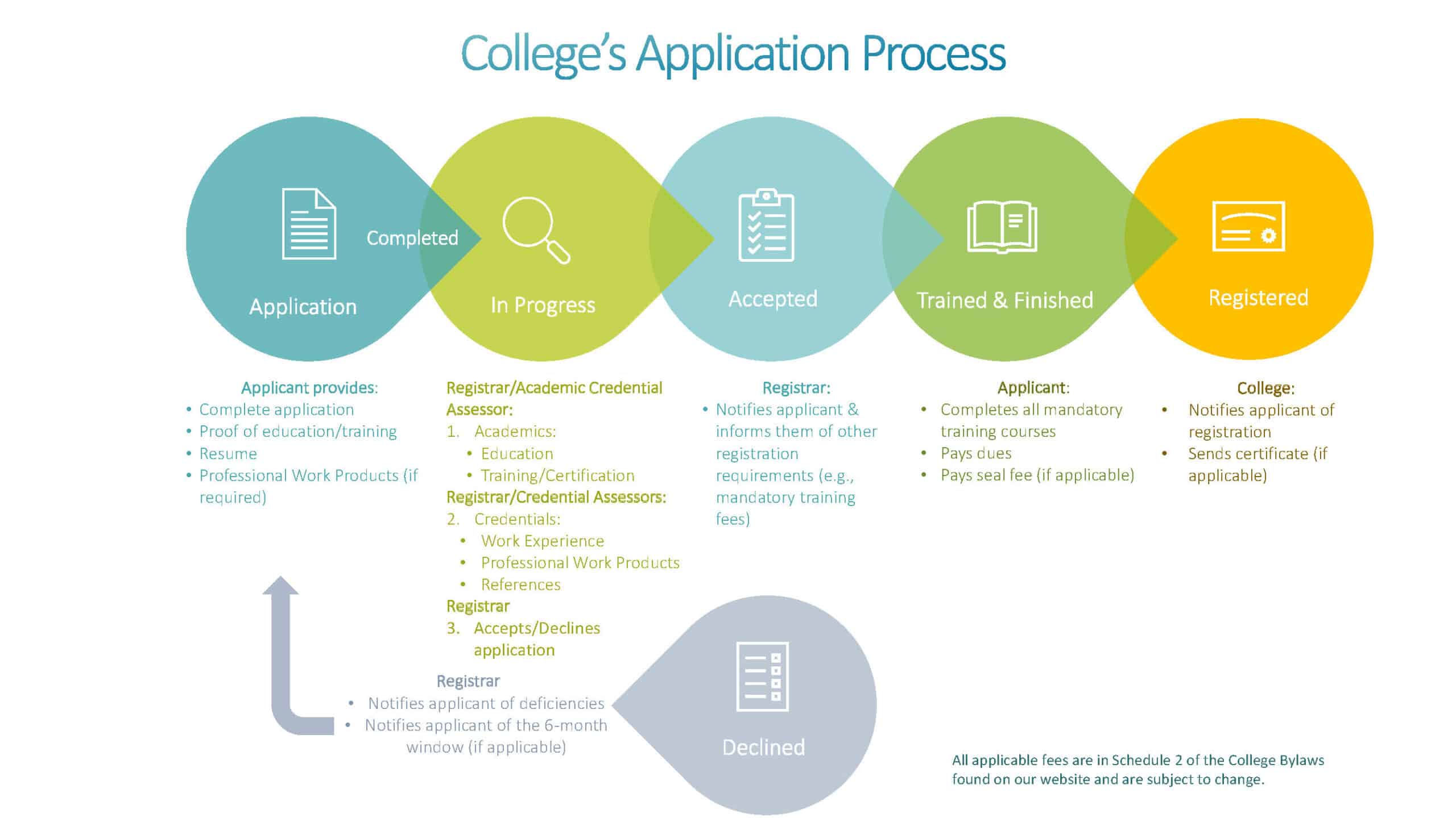 An email and letter will notify your application was declined. The letter will provide details as to why (i.e. the deficiency(ies)), potential resolutions and a timeline (usually 6 months) if you wish to be reassessed upon resolving any deficiency(ies). You may also wish to consult Part 5, Division 4, section 5-12 of the College bylaws regarding a Review on the Record.
